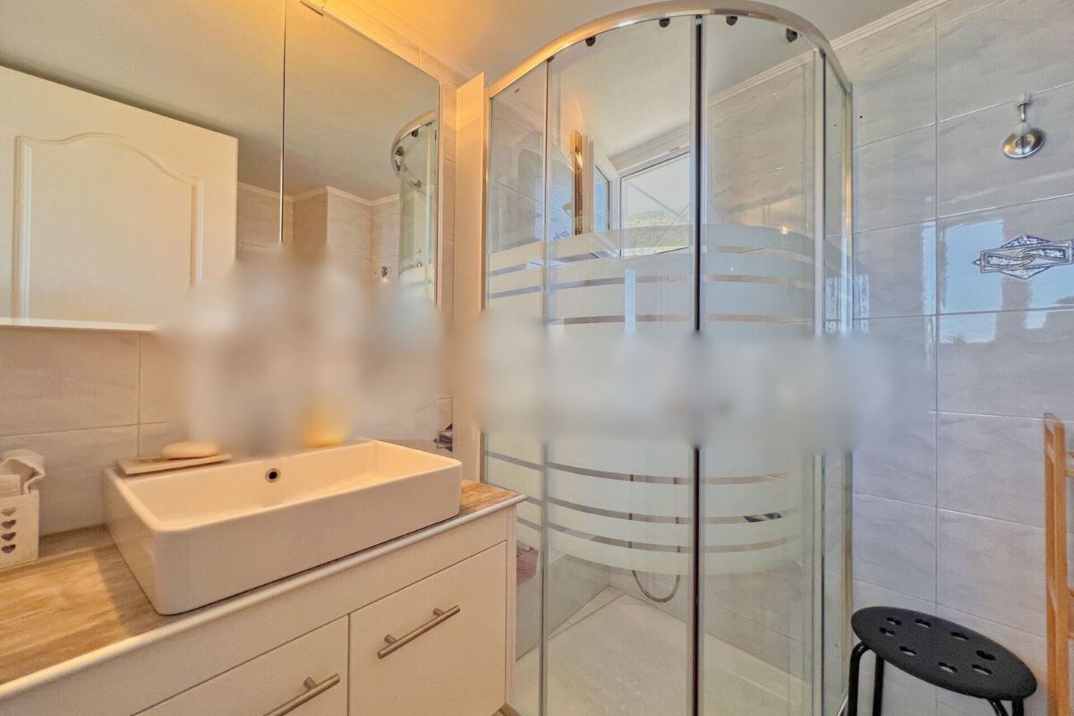 Upper floor: Two bright bedrooms, main bathroom and spacious balcony with open sea views.